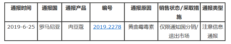 據(jù)歐盟食品和飼料快速預警系統(tǒng)(RASFF)消息,2019年6月25日,羅馬尼亞通過RASFF通報我國生產(chǎn)的肉豆蔻不合格。