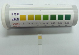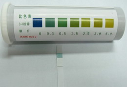 試紙顏色與色卡相同或相近以色卡標(biāo)示值報(bào)告結(jié)果。如試紙顏色在兩色卡之間,則取兩者的中間值。國(guó)家食品衛(wèi)生標(biāo)準(zhǔn)BG2716-2005對(duì)食用植物油酸價(jià)和過氧化值有一個(gè)統(tǒng)一的最高限量標(biāo)準(zhǔn),即植物原油酸價(jià)≤4mg KOH/g,食用植物油酸價(jià)≤3mg KOH/g;植物原油和食用植物油的過氧化值都要≤0.25g/100g(相當(dāng)于19.7meq/Kg)。在國(guó)家其他標(biāo)準(zhǔn)中實(shí)行質(zhì)量分級(jí)管理,詳見下面參考資料。