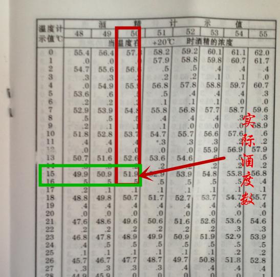 1.5:找到換算表,找到縱向酒度計讀數(shù)和橫向溫度計讀數(shù)對應的交叉值即為白酒實際酒精度(上右圖);