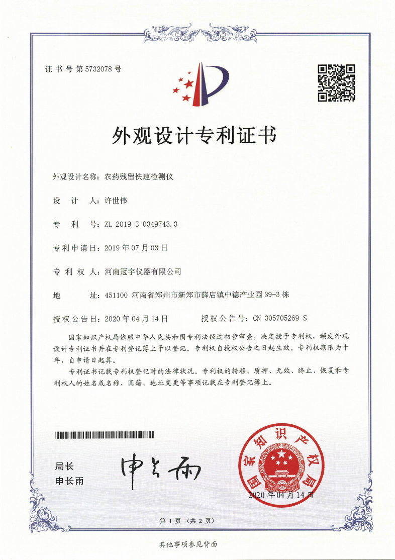 近日,河南冠宇儀器有限公司(以下簡稱:冠宇儀器)繼之前的多項(xiàng)軟件著作權(quán)證書及專利證書之后,又獲由國家知識(shí)產(chǎn)權(quán)局頒發(fā)的一項(xiàng)“農(nóng)藥殘留快速檢測儀外觀設(shè)計(jì)專利證書”,一系列的權(quán)威肯定,彰顯了冠宇儀器強(qiáng)大的技術(shù)研發(fā)能力,也體現(xiàn)出公司為客戶提供優(yōu)質(zhì)產(chǎn)品的強(qiáng)大決心。