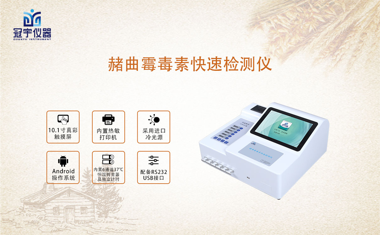 冠宇儀器真菌毒素檢測儀能夠快速定量檢測糧食、飼料、谷物、食用油、調(diào)味品等食品中T2毒素、嘔吐毒素、赭曲霉毒素、伏馬毒素、玉米赤霉烯酮,適用于糧油監(jiān)測中心、糧油飼料生產(chǎn)加工、食品加工貿(mào)易、畜禽養(yǎng)殖戶自查、工商質(zhì)監(jiān)部門用于市場快速篩查等。杜絕赭曲霉毒素超標的糧食原料及食品流入市場。造成危害。