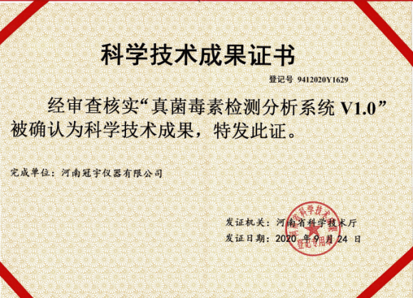 河南冠宇儀器有限公司(以下簡稱:冠宇儀器)繼多項軟件著作權(quán)證書、實用新型專利證書、計算機軟件著作權(quán)等一系列證書之后,又獲由河南省科學技術(shù)廳頒發(fā)的一項“真菌毒素檢測分析系統(tǒng)V1.0科學技術(shù)成果證書”,一系列的權(quán)威肯定,彰顯了冠宇儀器強大的技術(shù)研發(fā)能力,也體現(xiàn)出公司為客戶提供優(yōu)質(zhì)產(chǎn)品的強大決心。
