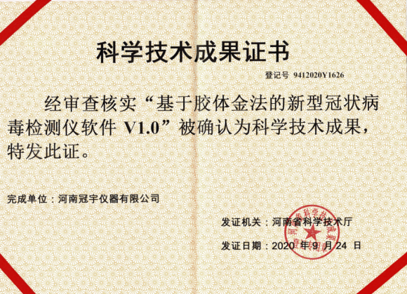 河南冠宇儀器有限公司(以下簡(jiǎn)稱(chēng):冠宇儀器)繼多項(xiàng)軟件著作權(quán)證書(shū)、實(shí)用新型專(zhuān)利證書(shū)、計(jì)算機(jī)軟件著作權(quán)等一系列證書(shū)之后,又獲由河南省科學(xué)技術(shù)廳頒發(fā)的一項(xiàng)“基于膠體金法的新型冠狀病毒檢測(cè)儀軟件V1.0科學(xué)技術(shù)成果證書(shū)”,一系列的權(quán)威肯定,彰顯了冠宇儀器強(qiáng)大的技術(shù)研發(fā)能力,也體現(xiàn)出公司為客戶提供優(yōu)質(zhì)產(chǎn)品的強(qiáng)大決心。