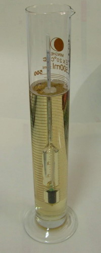 1.1:將蜂蜜輕輕混勻,再輕輕倒入250mL量筒中(取樣量約300mL),將潔凈干燥的蜂蜜比重計(波美計)輕 輕插入蜂蜜中央,任其自然下沉(下沉時間不少于15min)至不再下沉為止,水平觀察,按蜂蜜彎月面的上緣取讀數,同時用溫度計測定蜂蜜溫度。
