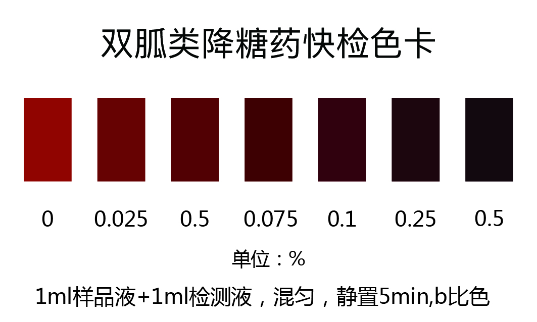 取上述濾液0.5 ml于玻璃比色皿或試管中,加入5滴檢測液,振蕩混勻,靜置5min,對照色卡比色,雙胍類降糖藥含量越高,顏色越深;