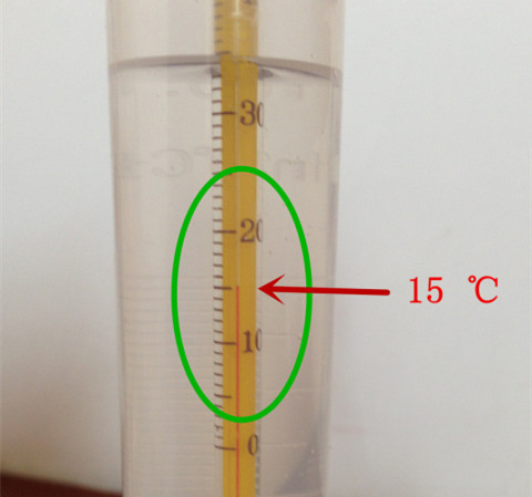 1.4:將溫度計放入量筒里不要貼筒壁,稍等片刻,目光平視看準讀數(shù)(下左圖為15℃);
